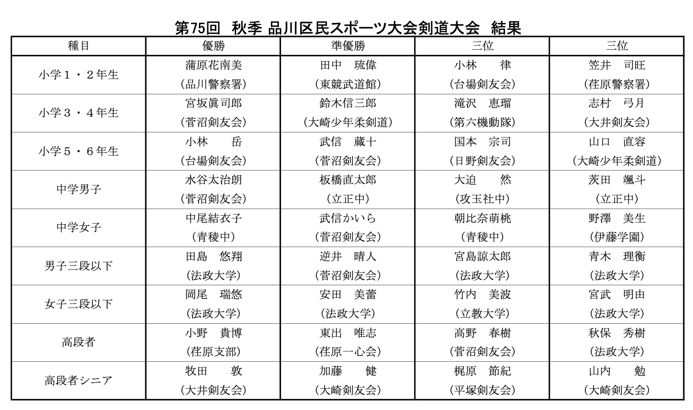 2025年6月1日に開催された、令和7年度 第75回 品川区民スポーツ大会(春季大会)剣道大会 (於 品川区立総合体育館)の結果は下記の通りです。
