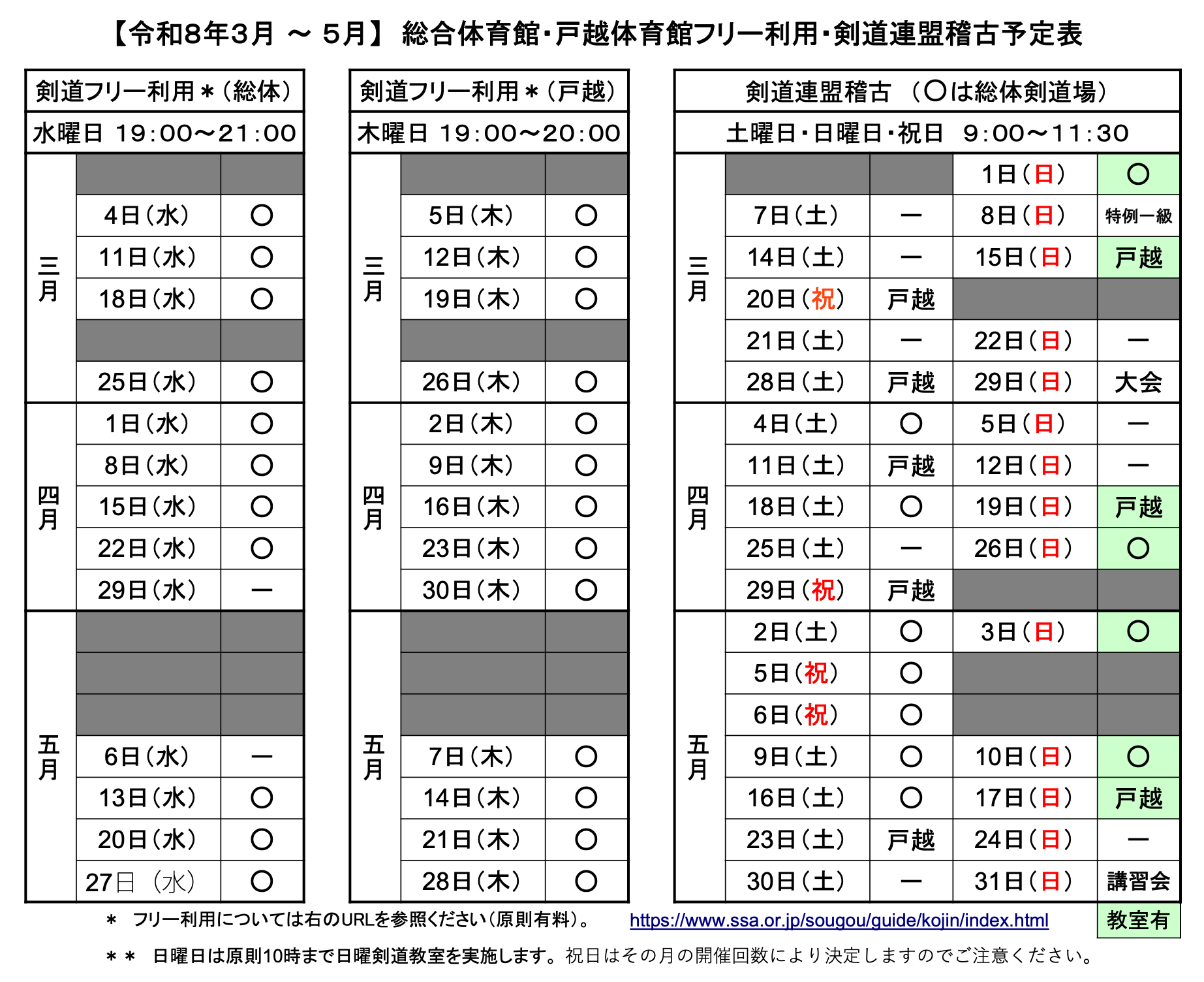 【品川区剣連】総合体育館・戸越体育館フリー利用・剣道連盟稽古予定表 2026年3月~5月 2026/02/25 最終更新日時 : 2026/02/25 tsuda 総合体育館・戸越体育館フリー利用・剣道連盟稽古予定表(PDF)PDFで閲覧ダウンロードできます